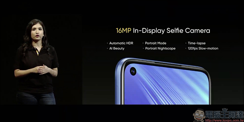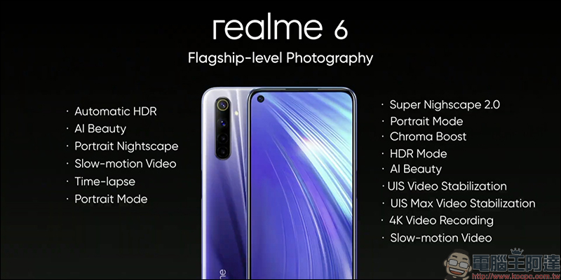 realme 6 配備 1,600 萬像素自拍相機,支援自動 HDR 、人像模式、縮時攝影、 AI 美顏、人像夜景模式與 120fps 超慢動作攝影: