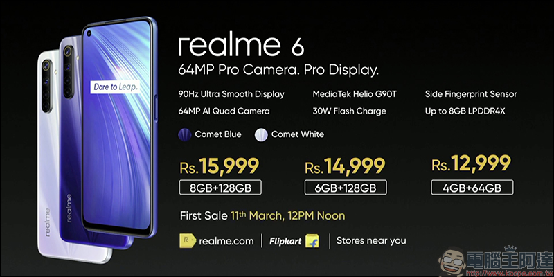 接著是大家關注的售價, realme 6 共推出三種規格配置, 4GB+64GB 版本售價為 12,999 印度盧比(約合新台幣 5,425 元); 6GB+128GB 售價為 14,999 印度盧比(約合新台幣 6,260 元); 8GB+128GB 版本售價 15,999 印度盧比(約合新台幣 6,677 元),將於 3 月 11 日率先於印度開賣。