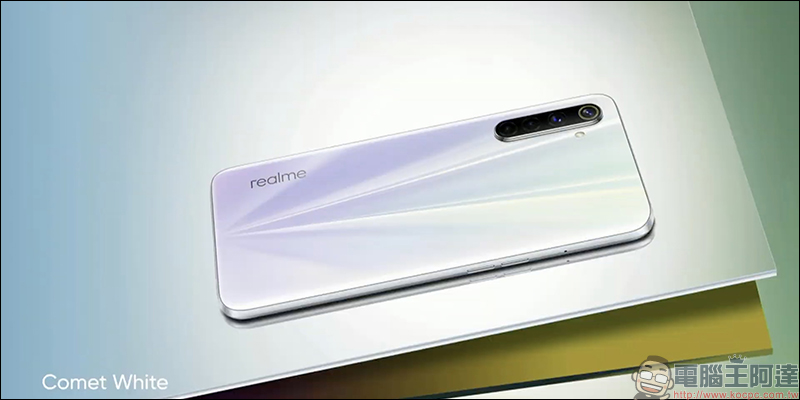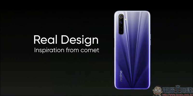 realme 6 機身背面設計靈感源自於「彗星」,呈現出放射狀的紋理,推出藍色(Comet Blue)和白色(Comet White)兩款配色選擇: