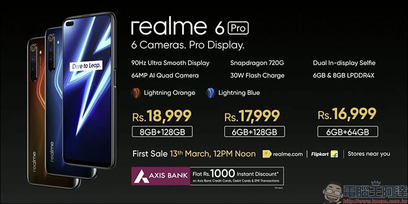 realme 6 Pro 同樣推出三種規格配置, 6GB+64GB 版本售價為 16,999 印度盧比(約合新台幣 7,095 元); 6GB+128GB 售價為 17,999 印度盧比(約合新台幣 7,512 元); 8GB+128GB 版本售價 18,999 印度盧比(約合新台幣 7,929 元),將於 3 月 13 日率先於印度開賣。