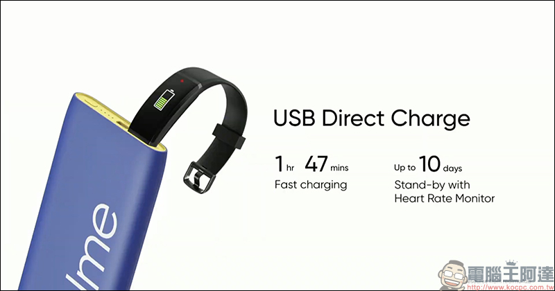 realme Band 智慧手環的充電方式相當特別,用戶不需要另外連接充電線,只要解開手環就能直接使用機身上的 USB Type-A 充電連接埠進行充電: