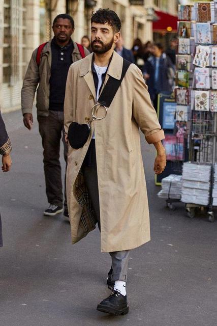 型男最愛的卡其色風衣穿搭套路,推薦選擇以多層疊搭的穿著技巧,例如將素 TEE + 襯衫 + 卡其色風衣混合,立即帶來時髦兼具的迷人品味,另外混搭側背小包連結格外搶眼的街頭個性。