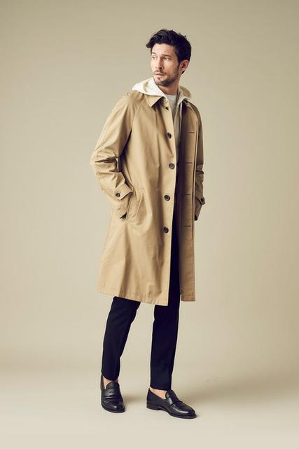 當想增加衣著層次的時候,不妨嘗試在卡其色風衣內搭連帽上衣,將帽子拉出於外套上能為造型提升不一樣的豐富視覺,如果同時希望身形能修飾的話,以九分褲或者同色系搭配瞬間顯瘦又挑高。