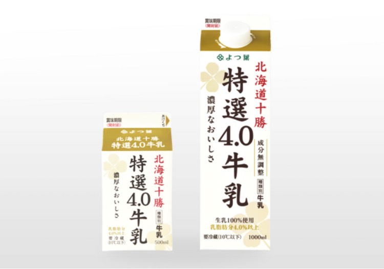 北海道的牛乳相當出名,當地酪農業發達有著引以為傲的畜牧技術,有「日本的食材庫」之稱。出產的牛乳更是品質保證,「四葉特選4.0牛乳」有著日本全國飲用牛乳公證交易協會所發的特選認證,乳質含量更達4.0%以上。在製造過程也很小心必須經過殺菌密封包裝,讓產品送到消費者手中每一口都濃郁不厚重!