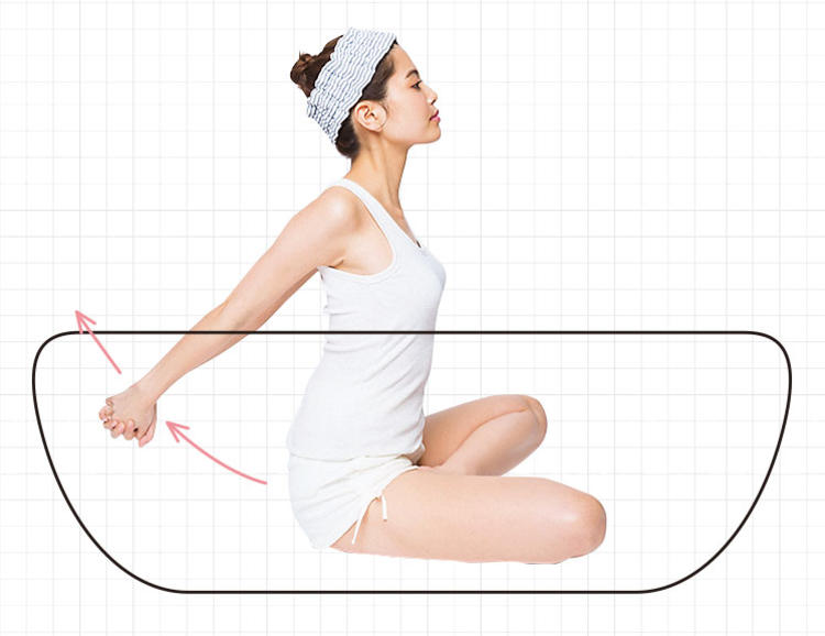 把兩手放在後方再握緊,挺胸抬頭,放鬆胸前的肌肉。
