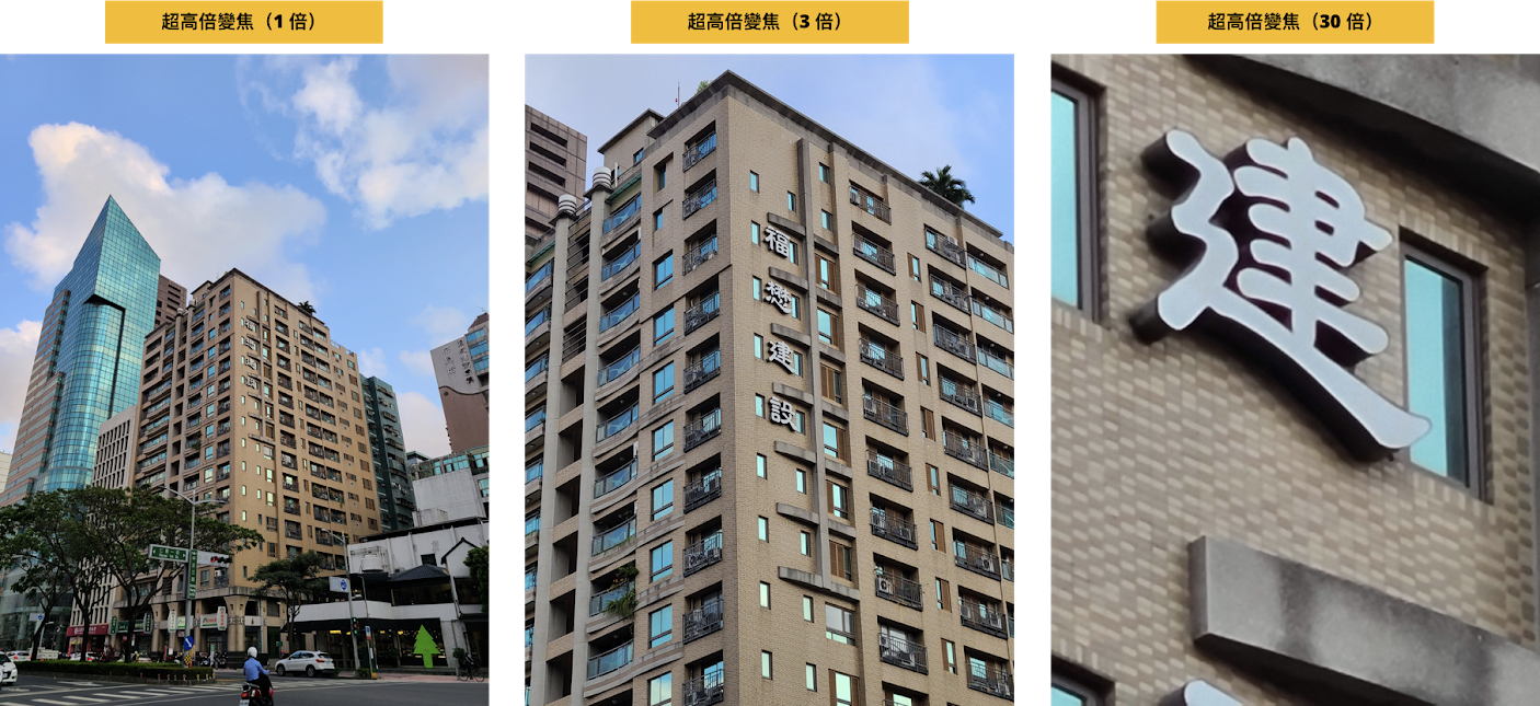 住宅外圍的字也都能拍得一清二楚,從 1 倍、3 倍到 30 倍為止,雖然 30 倍的邊緣會有模糊的部分,但字體能夠很清楚,建築的紋理也都很清晰。