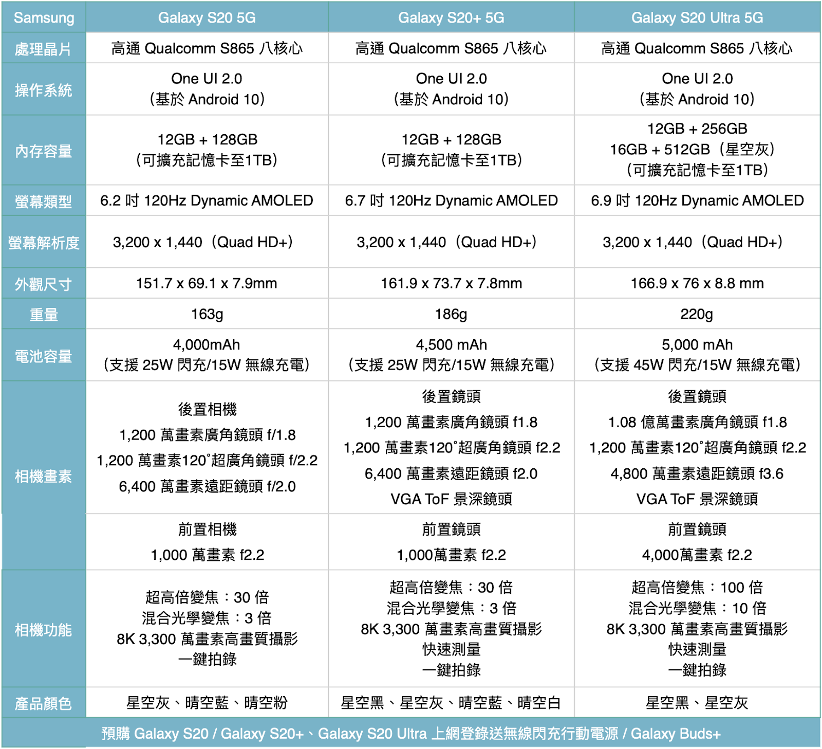 以下提供台灣販售的 Galaxy S20 5G / Galaxy S20+ 5G / Galaxy S20 Ultra 5G 給大家參考囉!