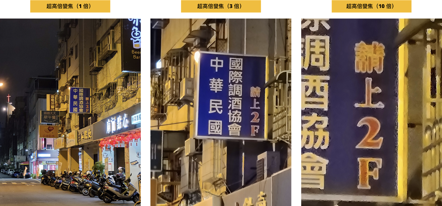 三個鏡頭都能透過夜間模式進行拍攝,快門讀秒的畫面很創新。畫面效果來看,開啟夜間模式後,在亮部細節,招牌曝光抑制,眩光抑制都做得不錯;在極暗處上解析力還是有些吃力,但可以感覺整體照片的明亮度、純淨度和細節上都明顯加強改善。