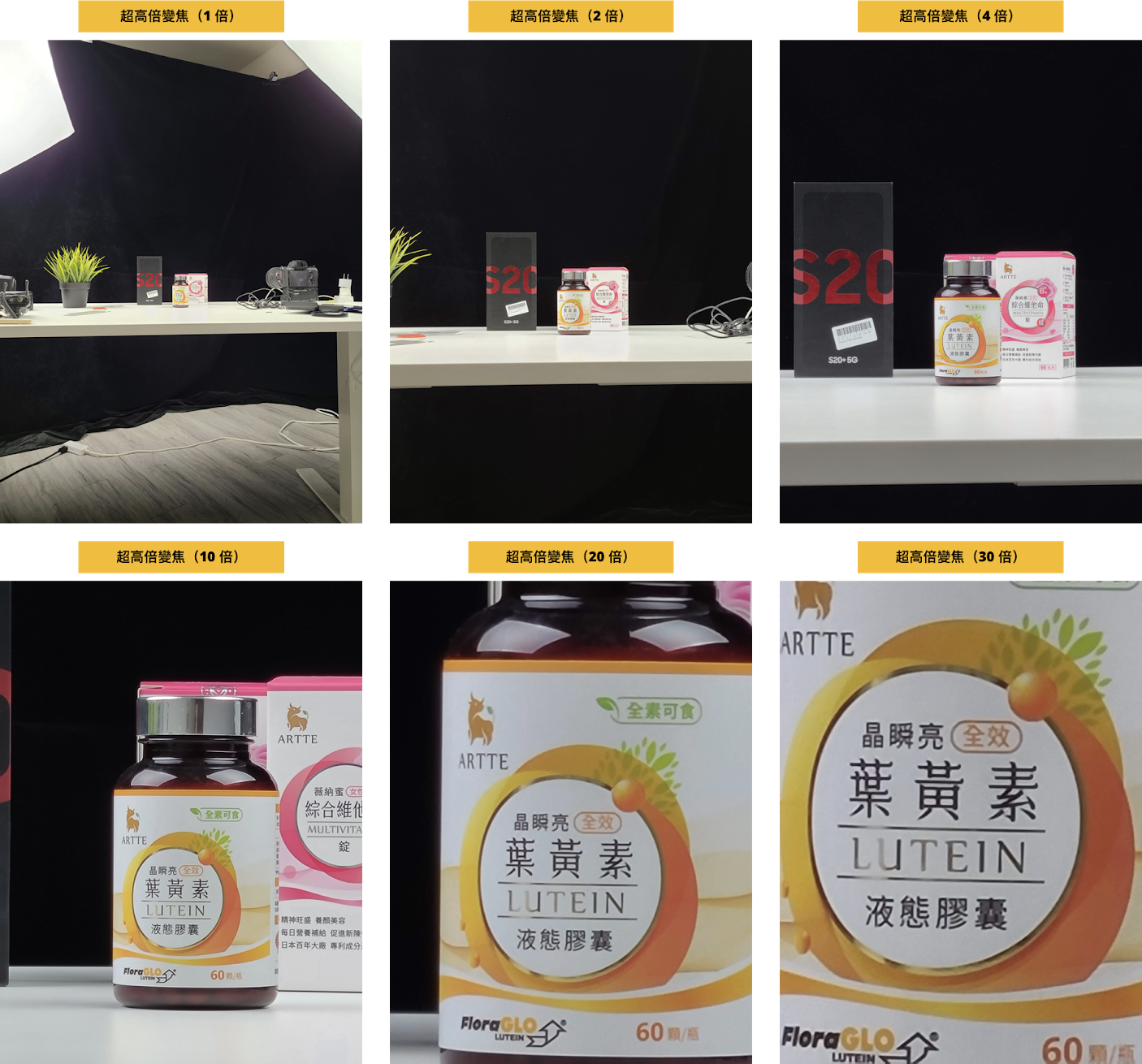 Galaxy S20+ 5G 為 30 倍超高倍變焦,連包裝盒上的字體也都能看得很清楚,從 1 倍、2 倍、4 倍、10 倍、20 倍到 30 倍為止,即使有一段距離也還算清晰,字體的邊緣從 20 倍開始就會稍微有點糊,30 倍算是「可以看得到、但邊緣會不太清楚」。