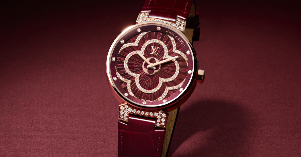 面盤以經典飾花圖騰為主軸,作為LV經典「Tambour」錶款延伸而出的「Tambour Moon Divine」,則以女錶市場為大宗,不僅保有其原創精神,錶殼採用類似新月的曲線,型態更為豐富,無論是黑、红漆面來是白色珍珠母貝錶盤白色,隨著鑲滿鑽石的Monogram花瓣輪廓,以及凹凸有致的放射狀紋飾,讓妳不自將目光深深吸引到錶款核心,巧妙營造出美麗的疊影與反射效果。