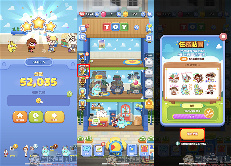 完成 5 個新關卡後,就能前往遊戲主畫面開啟任務貼圖頁面,點選「領取貼圖」前往貼圖下載連結。貼圖下載連結也會整理在文章下方,不過必須完成任務才能啟動下載按鈕。