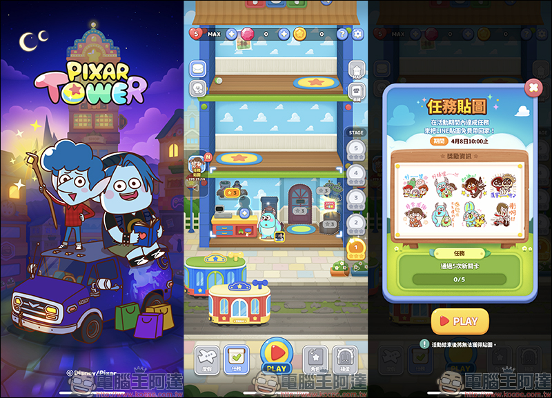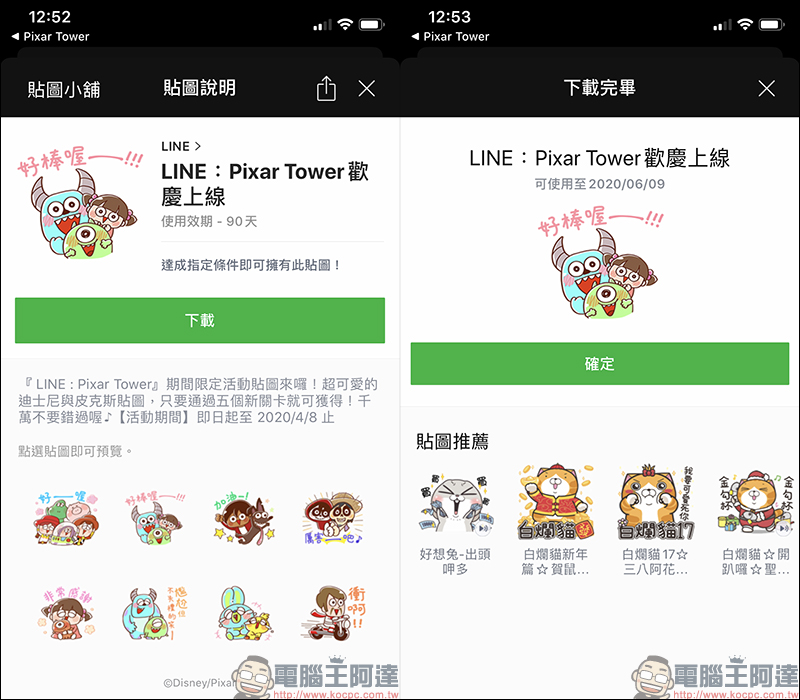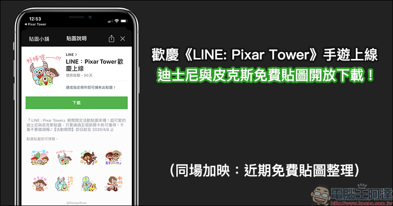 「LINE:Pixar Tower 歡慶上線」免費 LINE 貼圖的下載期限從即日起至 2020 年 4 月 8 日止,只要在這期間之前完成任務並下載即可使用 90 天。貼圖下載連結:點我前往