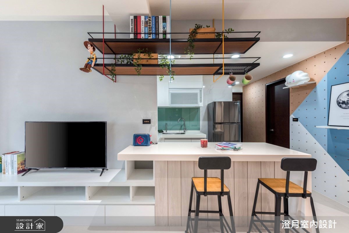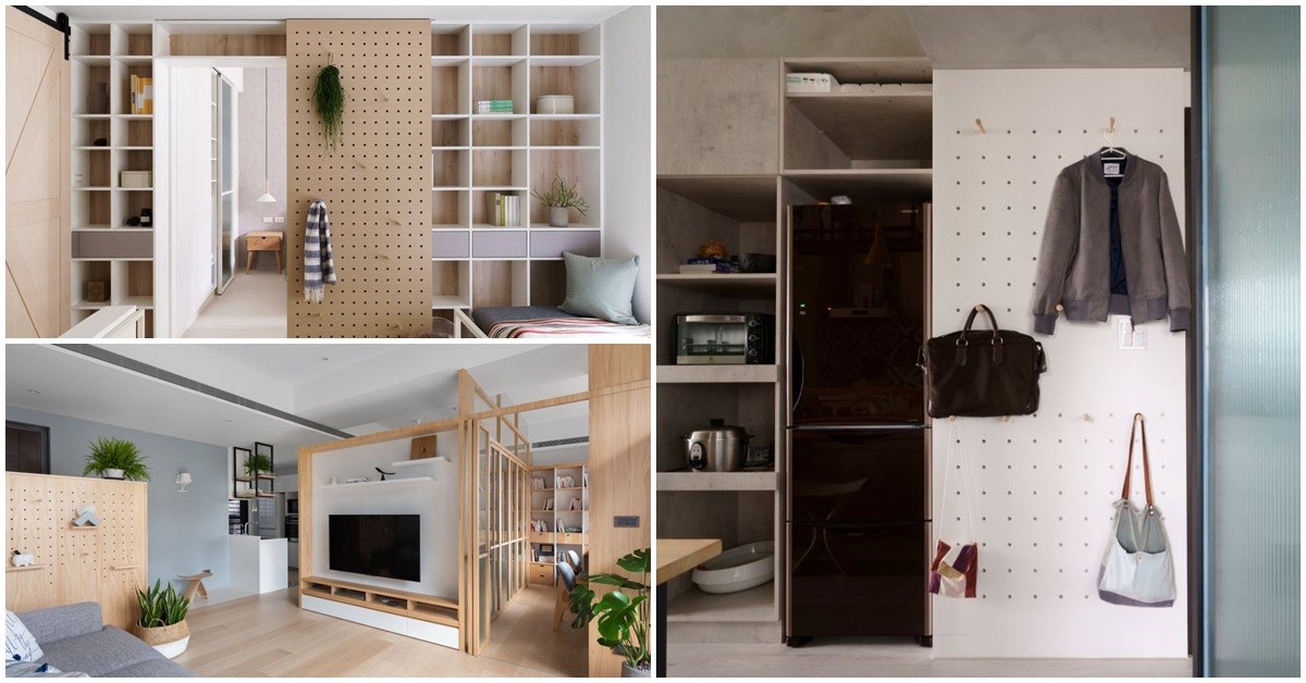 客廳的洞洞板設計更重視與機能的結合,比方玄關鞋櫃的背面就能作為小物展示區,位於沙發旁的位置可以擺放遙控器,讓空間能獲得有效利用。或者洞洞板也能跟電視牆作整合,收納一些家電跟公仔,當有打掃清潔居家的需求時,吸塵器就能立刻派上用場,省去一個收納櫃或儲藏室的空間,很適合小坪數的居家喔!