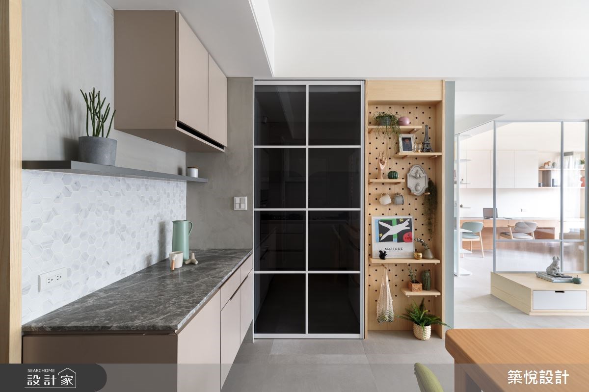廚房很適合施工整面牆的洞洞板,因為走道若是擺上收納櫃,容易造成動線的不順暢,洞洞板則能夠善用立面的收納功能,將烘焙手套、剪刀、鍋鏟、調味品都放上去,補充廚具不足的收納空間,而且還能晾乾通風,使廚房用品不會生鏽發霉,發揮出洞洞板設計的強大功效。