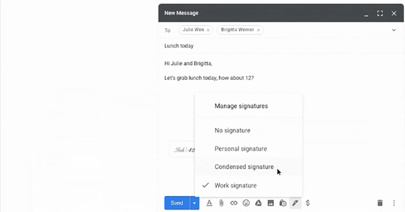 首先,到了前述設定的位置(Gmail 畫面右上角的「設定 > 一班設定 > 簽名」)將可以看到創建新簽名檔的功能。不過未來的新郵件與郵件回覆的底部功能列之中,也可以看到新增了一個「簽名」的按鈕(長得就像支筆),在此也可進行簽名檔的快速選取與管理: