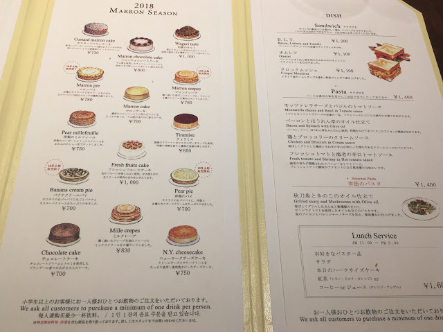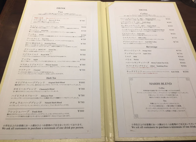HARBS的菜單以蛋糕及茶類為主,中午時分還可點三明治等輕食,晚上只可點蛋糕。一場來到,當然要試它的招牌,所以我就點了水果千層蛋糕Mille crepes跟季節限定茶飲Marron&Milk。