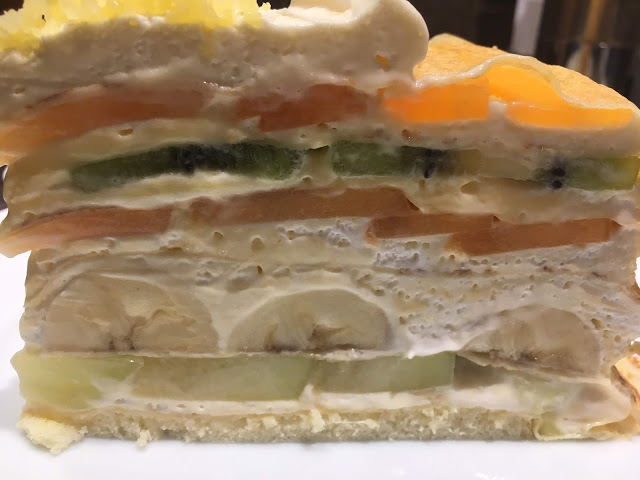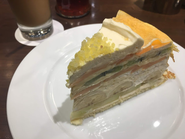 接下來蛋糕也很快上桌!830日幣(未稅)的蛋糕雖然不算便宜,但份量頗大。蛋糕共有5層,每片可麗餅皮上抹上特製生奶油及水果。上層是哈密瓜跟奇異果,然後是香蕉跟蜜瓜。