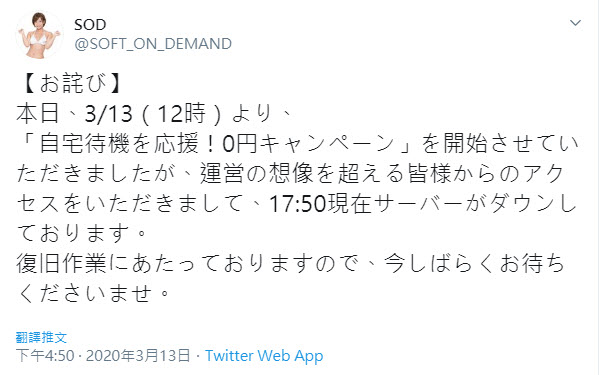 近期受到COVID-19(武漢肺炎)疫情擴散影響,而針對是否進入「緊急事態」的日本,知名成人影片公司Soft On Demand(簡稱SOD),近期在推特上公開推出「200部成人影片0元」活動,包含Prime會員在內,即日起至31日登入會員,即可以0元價格購買包含VR在內精選的200部成人影片。