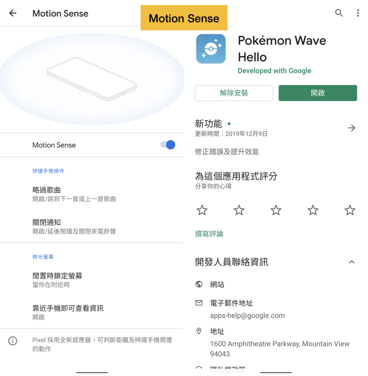 我們首先要把「Motion Sense」隔空手勢操作的功能開啟!點選「設定」的「系統」,接著找到「Motion Sense」並且開啟這項功能。接著在 Google Play 商店下載「Pokémon Wave Hello」應用程式,就可以開始和寶可夢互動。
