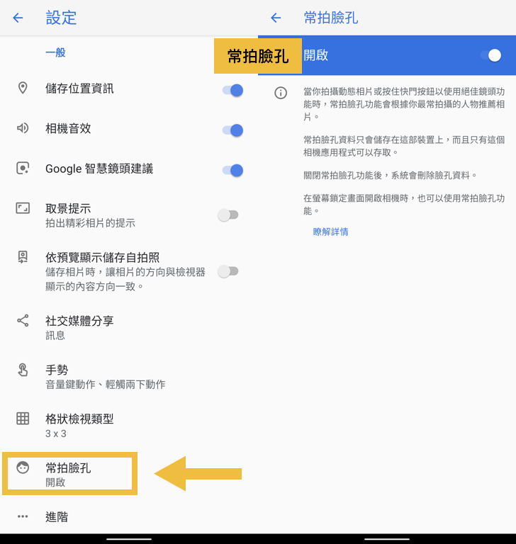 Google 相機有一個功能,可以在開啟「動態照片」或「按著快門按鈕」(也就是錄影)時,讓相機自動辨識並對焦在常拍的臉孔上,讓動態的照片不失焦。所有臉孔資料會儲存在手機上,不會傳送給 Google,若是關閉「常拍臉孔」的功能,系統也會刪除這些資料。