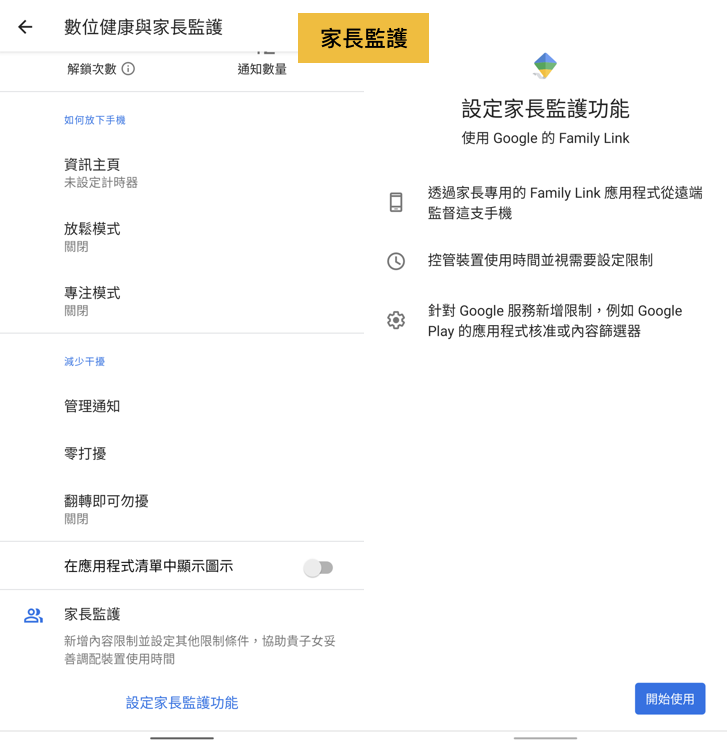 另外還有「家長監護」的功能,若您是「家長」可以下載「Google Family Link 家長版」App 就能限制子女的使用時間、允許或封鎖應用程式以及查看裝置所在地點等等。若您是「子女」的身份,則會被設定並篩選應用程式、設定就寢時間和裝置使用時間等等。只能求老爸老媽不要把最愛的 YouTube 和 Netflix 限制住啦!