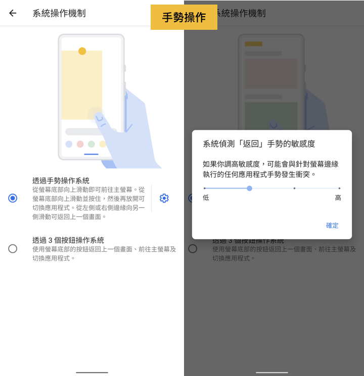 首先要先到「設定」點開「系統」的頁面,選擇「手勢」後再點開「系統操作機制」,按下「透過手勢操作系統」就能開啟功能了!點選齒輪就能設定「偵測返回手勢的敏感度,就可以依照需求調整敏感程度喔。