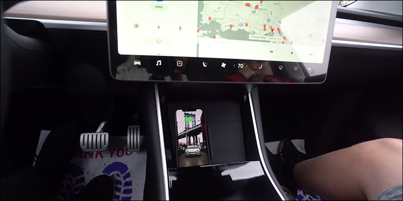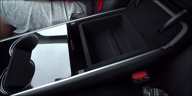 中控台及中央扶手的收納空間、置杯架則與 TESLA 其他車款設計相似,在 Model Y 也配備無線充電板,可同時為兩支手機進行無線充電:
