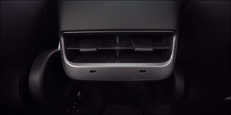 在 Model Y 的後座,除配備冷氣出風口也也跟上近年的充電規格趨勢提供 2 組 USB Type-C 充電接孔: