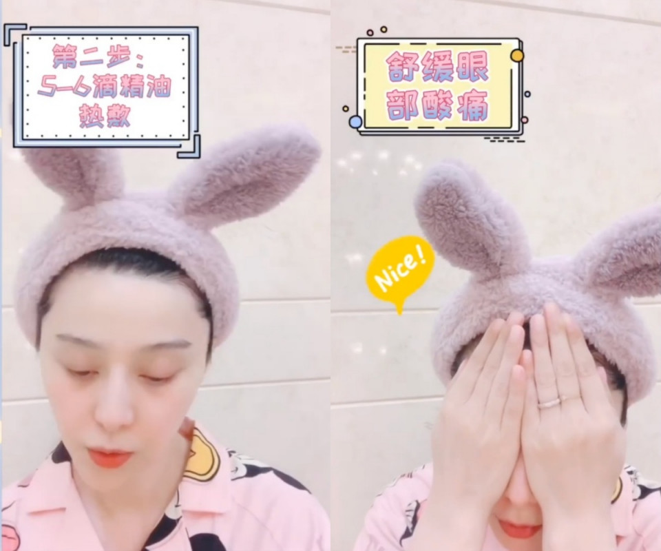 范冰冰分享,因為工作、熬夜關係,自己其實黑眼圈非常嚴重,不時也會覺得眼睛痠痛、不舒服,因此會用精油熱敷的方式,來緩潔疲勞、不適感。先在手掌心上滴5-6精油,接著搓熱、加溫手心精油,再敷上眼窩停留15秒,讓手的溫度敷到眼睛上面。重複2-3次。