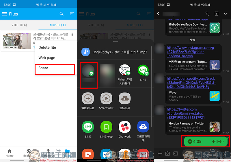 用戶能在 iTubeGo 的檔案頁面刪除檔案、以網頁開啟或是「分享」至其他應用程式。筆者這裡先以分享音樂檔至 LINE 聊天室為例,可以看到整段能接分享到聊天室以語音形式進行播放: