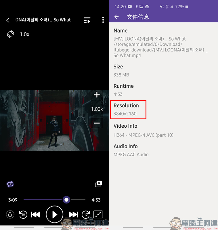 在 iTubeGo App 下載好這段 4K 影片後,透過 KMPlayer Pro 確認其解析度為 3840*2160 沒問題: