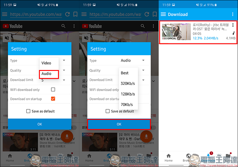除了影片,有時我們在 YouTube 或其他平台聽到些不錯的歌曲,下載只是為了聆聽音樂而不用觀看畫面,那麼在下載設定選擇「Audio(音頻)」即可下載為音樂檔,音頻品質 iTubeGo 也支援最高 320kbps :