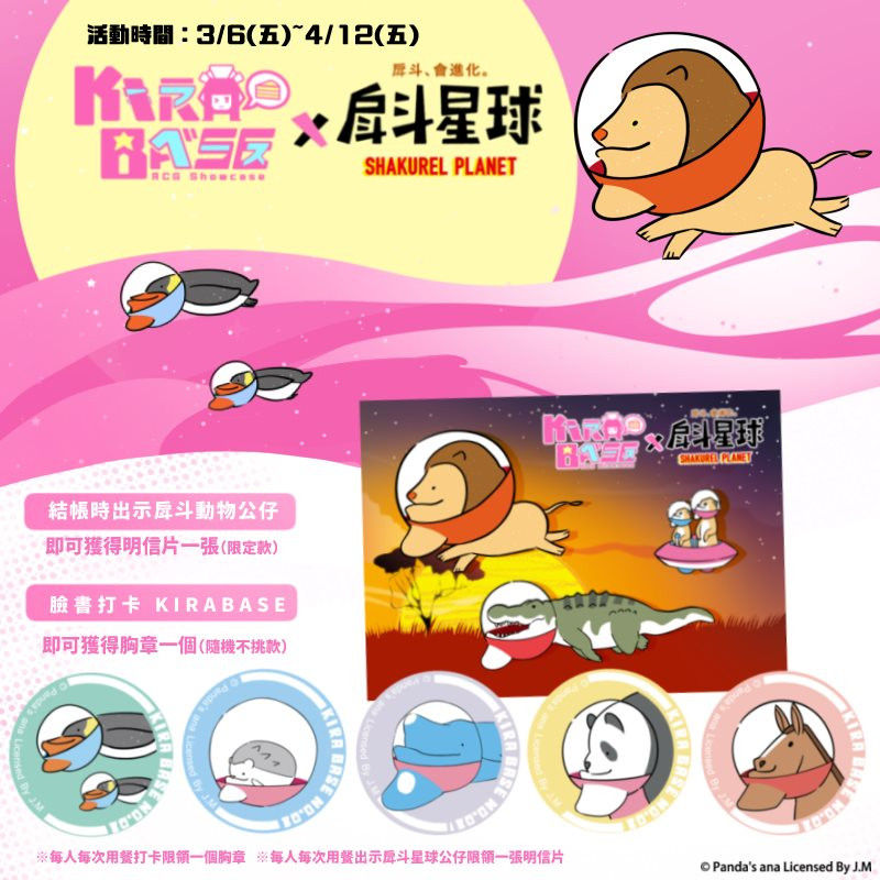 另外,這次活動除了讓粉絲們可以和戽斗動物們在餐廳裡一起用餐、收集期間限定的特典外,KIRABASE也額外為廣大的粉絲加碼兩個有趣的小任務,第一個是大家可以攜帶戽斗動物的公仔,在結帳時出示就可以得到一張限定款明信片~第二個任務則是在餐廳內打卡,就能獲得一個胸章(隨機不挑款)。
