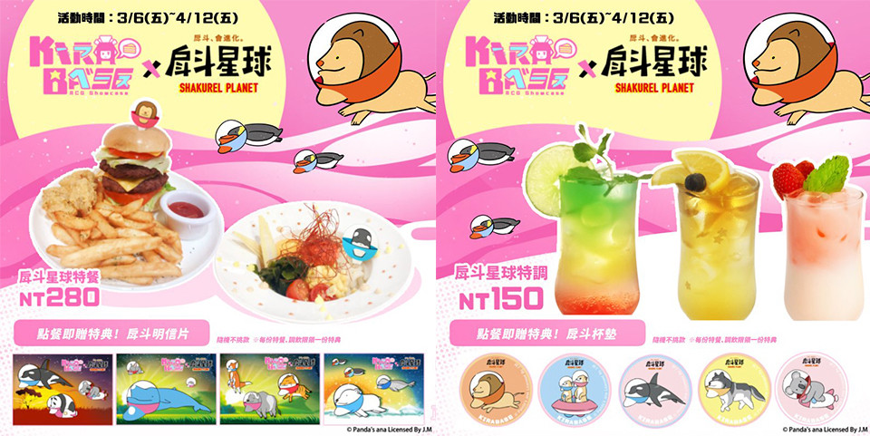 KIRABASE不僅提供多樣化套餐、甜點、調飲等,每個禮拜還會有舞蹈演出及電玩遊戲互動~而風靡日本及台灣的「戽斗星球」,因為爆笑獨特的戽斗下巴造型,戽斗動物們的醜萌魅力滿分!也讓許多扭蛋迷們失心瘋,直接收集整套戽斗動物~在這次KIRABASE與戽斗星球的聯名主題店裡,除了有現場佈置的戽斗動物、特製餐點,還有限定特典等待粉絲收集!