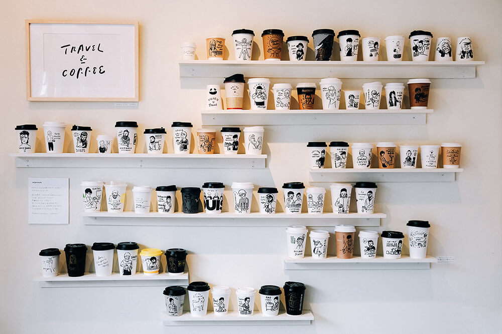 在旅行途中總沒忘了親臨一間間咖啡館,將咖啡師專注的沖煮畫面,以畫筆留在杯身上。
