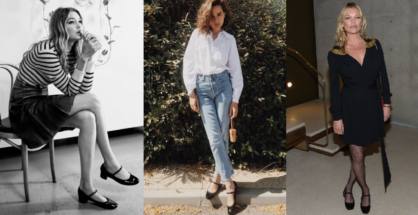 ▲Rose Mary Jane 約 NT. 11,222,右:為 Gigi Hadid 拍攝廣告的形象照、左:代言人 Kate Moss's 示範穿搭照。圖片 / Repetto、telegraph.co.uk