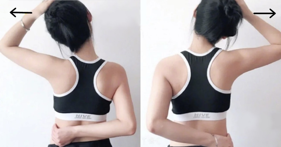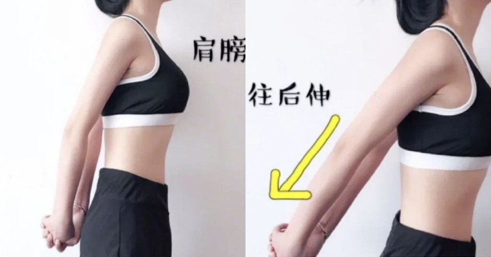 這一步可以幫助舒緩肩頸緊繃,減少駝背、姿勢不良狀況。首先將左手放在後背處,接著以右手壓向左手關節,維持10秒後再放鬆換邊做。兩邊都做完3組之後,接著將右手背到背後,左手抓住右手手腕,並將右手往左側拉伸,這一步要注意身體要挺直,腰部不要彎曲、傾斜,才能真正運動到上斜方肌跟肩頸處。這組運動一邊堅持20秒,每邊做3次。