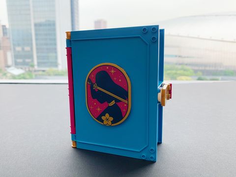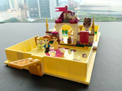 故事書細節:地上散落著最聰明的貝兒公主喜歡看的書,裡面有2款迷你娃娃角色,分別是貝兒公主與會變身成亞當王子的野獸。衣櫃夫人、盧米亞、阿奇及葛士華的樂高迪士尼角色也都俱全。