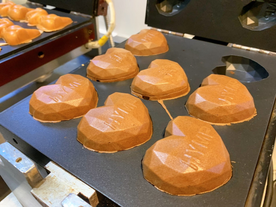 「紅玉滿赤心雞蛋糕」是以愛心形狀為概念發想,老闆特別打造了心形造型來製作,心型的雞蛋糕可以說是可愛程度破表啊~除了造型用心,雞蛋糕上更烙印上了「初、愛、善、良、決、誠、耐、雄、信」等的字樣,邊吃邊拼字也是很有樂趣!