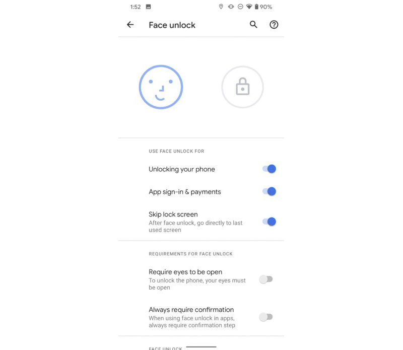 根據 Android Police 的進一步測試,這項功能無論是否有配戴眼鏡與多數光源環境下皆可以支援,並且會要求一定的睜眼程度。雖說目前看來 Google 似乎準備要等到 Android 11 才提供這個增進的臉部解鎖功能,不過說不定在 DP2 上測試完成後,在接下來的 Android 10 或者是 Pixel Feature Drop 有機會看到囉。