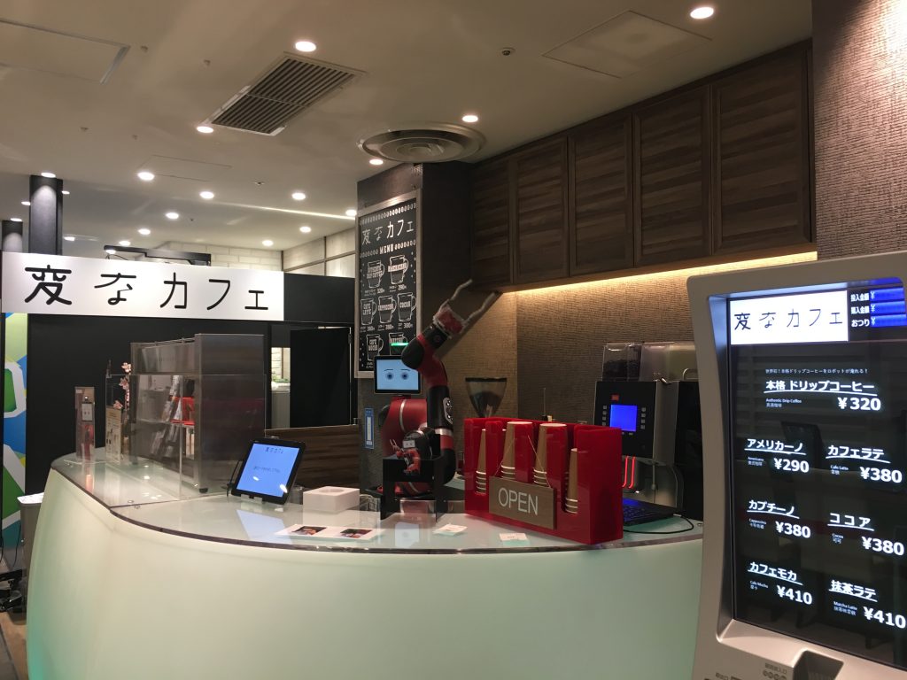 離開MAGNET by SHIBUYA 109後不用過馬路,沿著井之頭通馬路一直走就會看到一座綠油油的商場「MODI」,這裡雖然店舖不多,但在地下一樓有家世界唯一的機器人咖啡店「変なカフェ」(奇怪的咖啡店)!在這個小小的店面你不會看到任何人類的店員,只有一名機器人咖啡師在等著你。