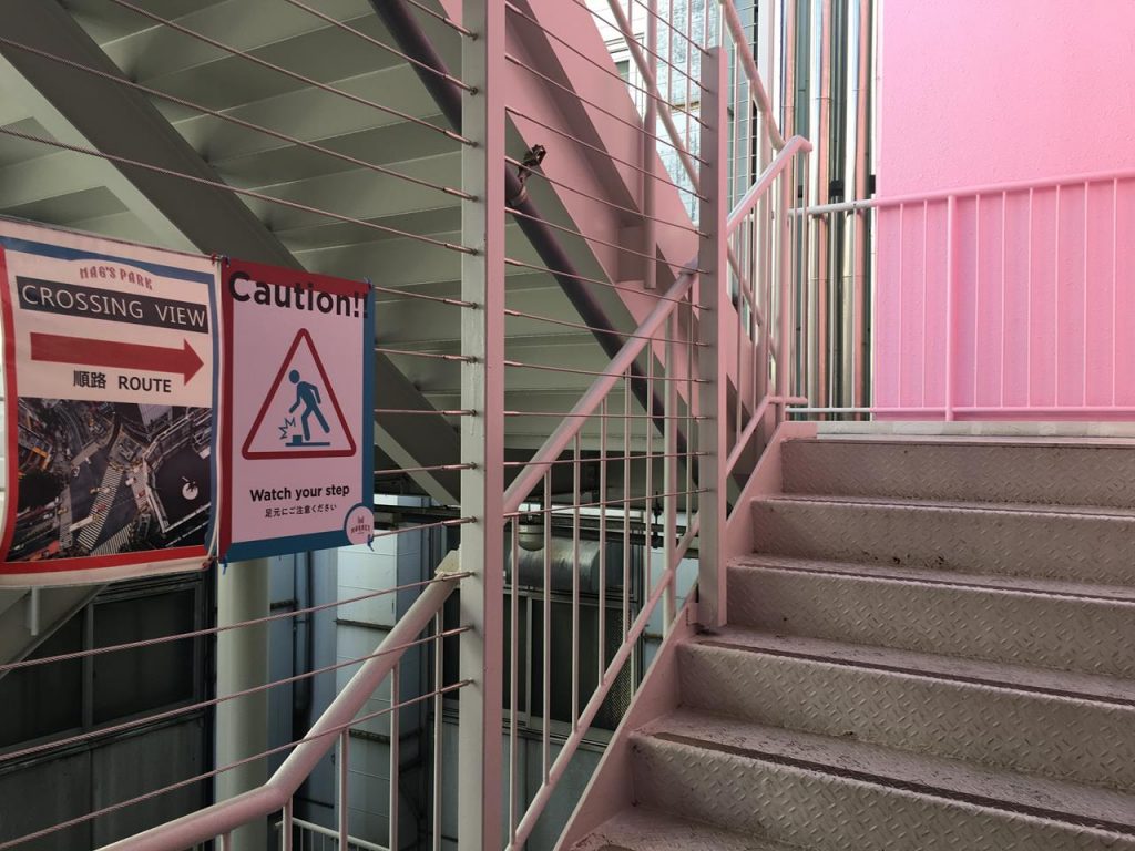 利用電梯上到7樓,跟著指示走到大門前,雖然它看起來很像逃生門,但放心推開它吧(笑) 走上樓梯和穿過平台你就會來到觀景台了!在這個小小的展望台你可以飽覽十字馬路的景色,在平日下午人流很少,所以你可以從不同角度大拍特拍!唯一有點可惜的是因為裝上了玻璃,所以很容易拍到自己的倒影,需要多點拍照技巧。