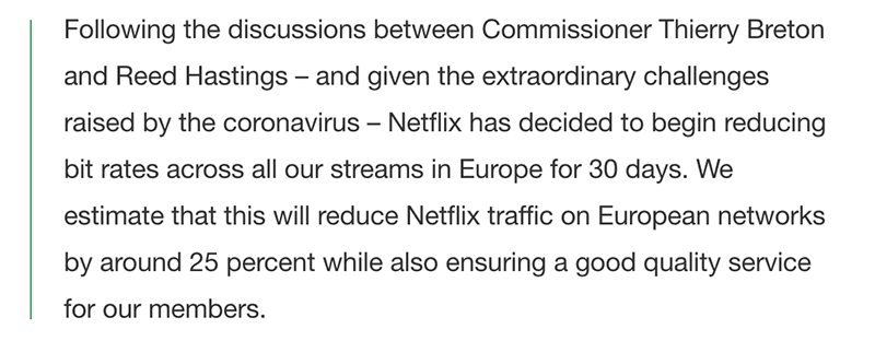 根據 Netflix 向外媒 Business Insider 的聲明,可以看到該公司創辦人 Reed Hastings,在與歐盟網路市場專員 Thierry Breton 的溝通之後,確認為因應疫情帶來的重大威脅,Netflix 決定將在未來 30 日在歐洲降低串流播放的 bit rates 位元率的新做法,此舉預期將可減緩因疫情導致網路流量負擔大增的狀況。