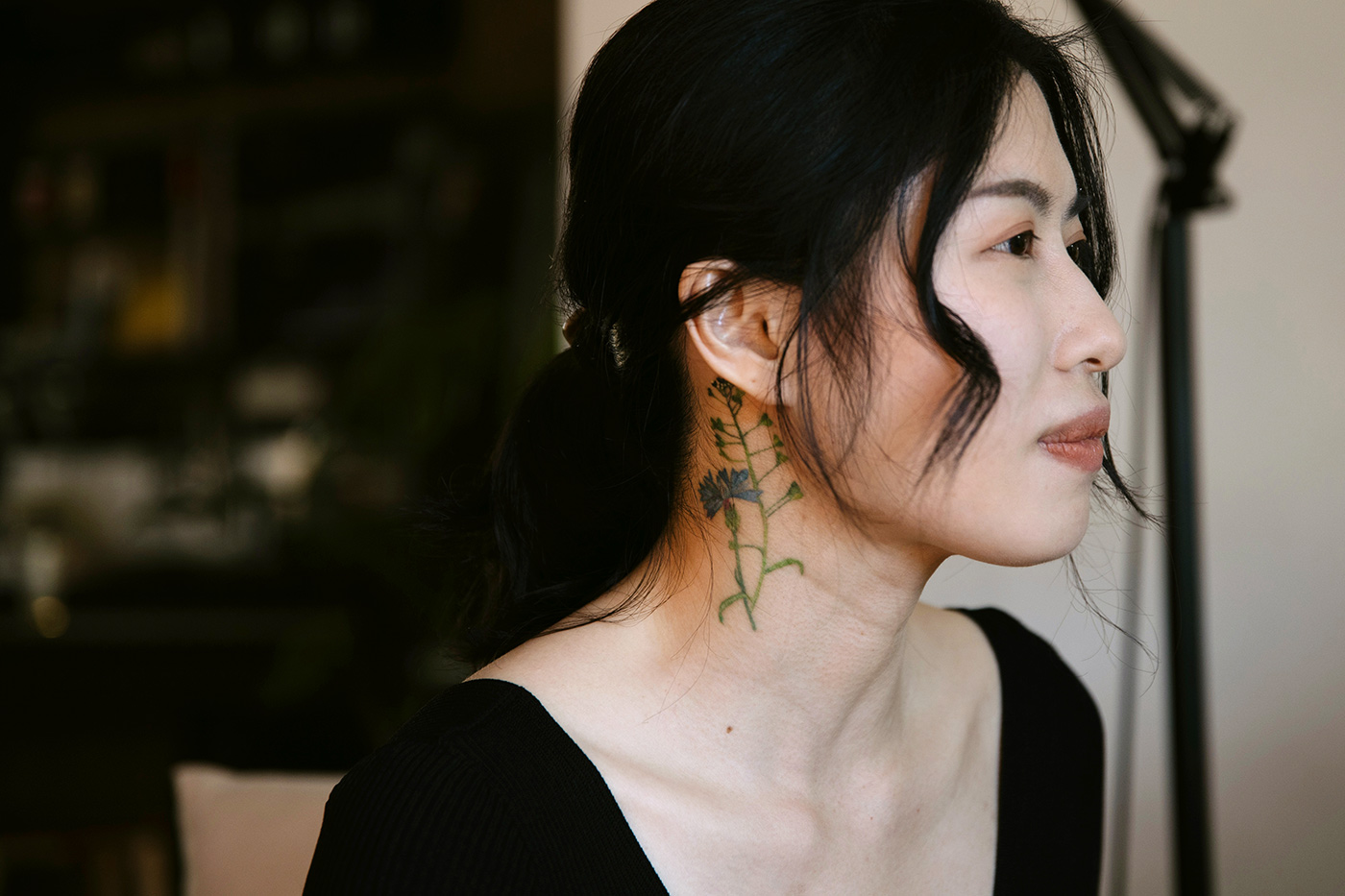 纖細、有生命力的植物刺青在 Yuty 白皙的皮膚上特別顯眼,談到這個刺青 Yuty 興奮地分享「這是一位跟我ㄧ樣喜歡刺青師 Rita 的作品,Rita ㄧ邊旅行ㄧ邊找當地漂亮的植物作為圖樣,我選的是愛心型芥菜花及矢車菊,雖然它們看起來很像雜草,但卻很有生命力。將植物拓印在脖子上的時候,難得與植物靠得如此近,朋友說這個刺青有魔咒,讓我就此越來越愛植物。」
