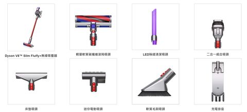 《Dyson V8 Slim Fluffy+ 無線吸塵器》共配有6個吸頭,包含: