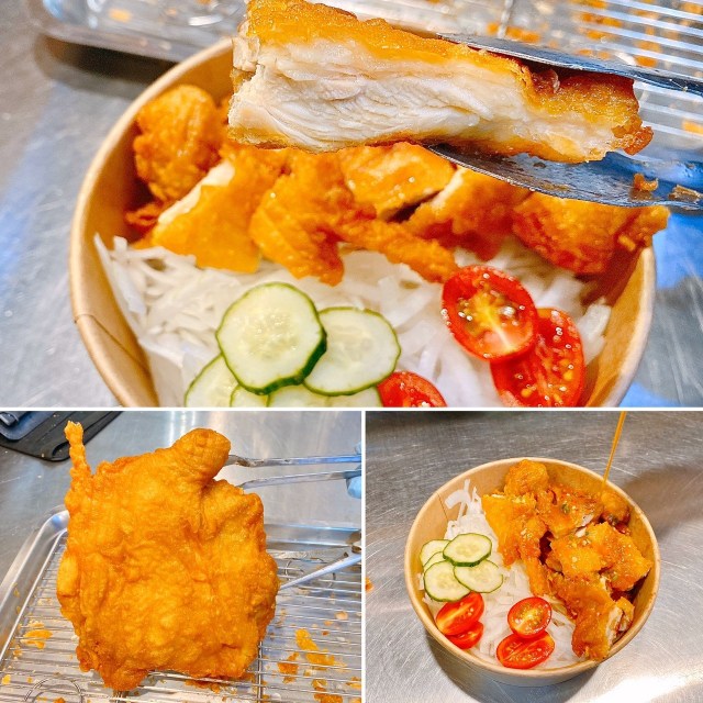 椒麻雞是用10兩重的無骨雞腿排,非常大塊厚實,炸粉是老闆特別調製的,所以外皮不是裹著厚重的粉,而是薄脆的!