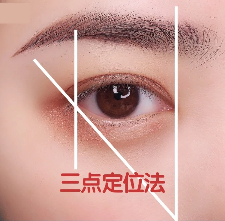 一般來說的三點定位眉毛如下:眉頭和眼頭切齊;眼尾往上延伸線找到眉峰;而鼻翼、眼尾的延伸線可以找到眉尾位置。