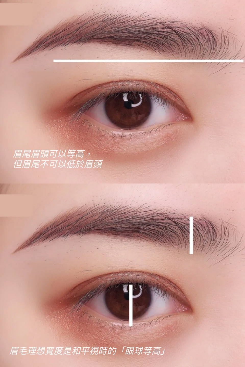 彩妝老師也補充我們常見的誤區說明,首先眉尾眉頭可以等高,但千萬不要讓眉尾低於眉頭,看起來會無精打采。眉毛也留意不要畫太粗,理想寬度是和平視時的「眼球等高」。