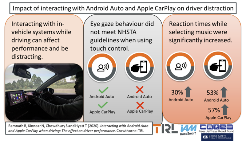 雖然這是一篇英國研究,不過其所探討的範疇與警示世人的角度,其實也是許多人沒特別注意之處。不知道有沒有人會好奇,到底目前十分流行的行動車載系統包括 Apple CarPlay 與 Android Auto 的支援,在提供更流暢的使用介面與更多應用的支援前提下,針對行車安全的部分又是否有比以往來得更好?或該說,有沒有比直接拿手機來用要好?