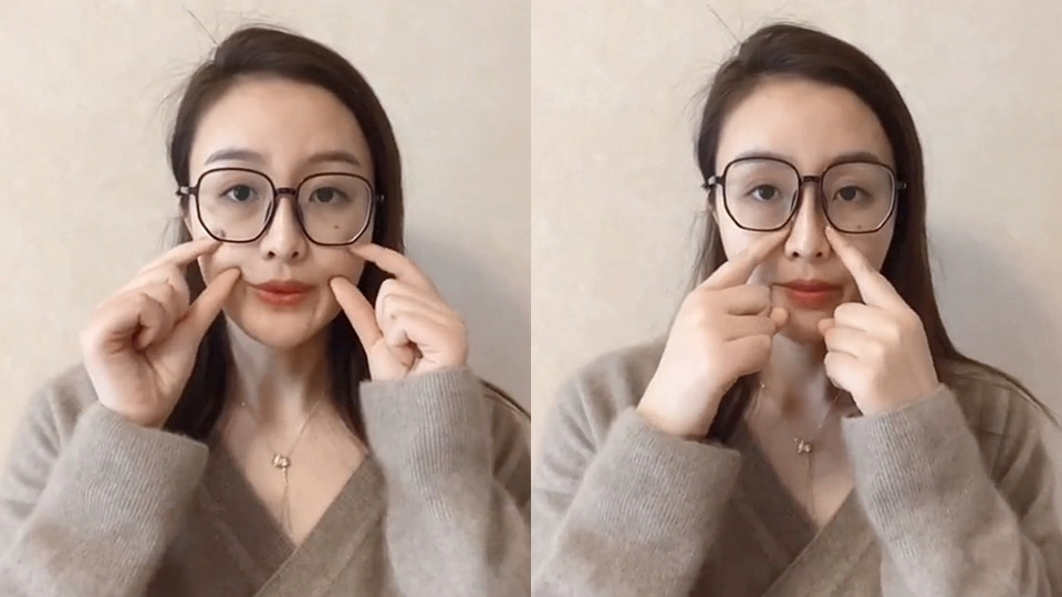 「面部中庭肌肉」運動動作:用手指捏住顴骨肌肉
